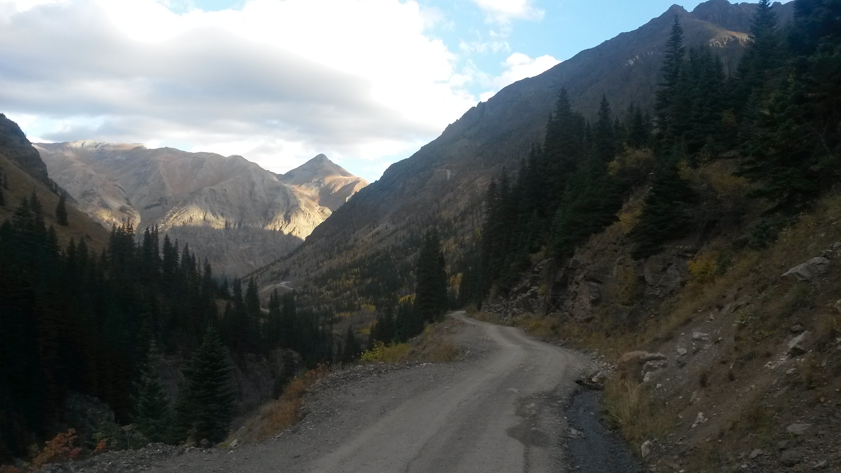 Due to partial day road closures north of Silverton, several of the folks cut out before the sun rose. Since Pam and I were heading south towards home we left at a more reasonable hour. The road back down into Silverton from our last campsite was picturesque in the morning light. The road is not what you would consider wide, but luckily the rush hour traffic was light.