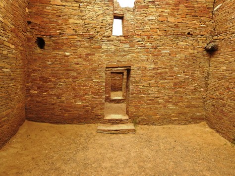 The next morning, we made our way to Aztec Ruins National Monument, a place we’ve driven by before but never stopped. The ruins there are ancestral Pueblo that were misnamed Aztec by early explorers to the region and the name stuck. Similar to what we were going to see at Chaco Canyon, the 900-year old ruins were multi-roomed, multi-storied quarters constructed from wood and stone. Nearly all the wood used in the 400 room ruins is gone, having been repurposed over the ages, causing some of the stone walls to collapse.