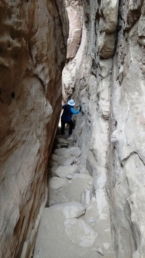 The Ranger said we should hike up to Pueblo Alto on top of the canyon wall but given the light rain we saved that for the next day. The climb up (and back down) through the rock was a lot of fun. Here is Pam leading the way back down the trail.